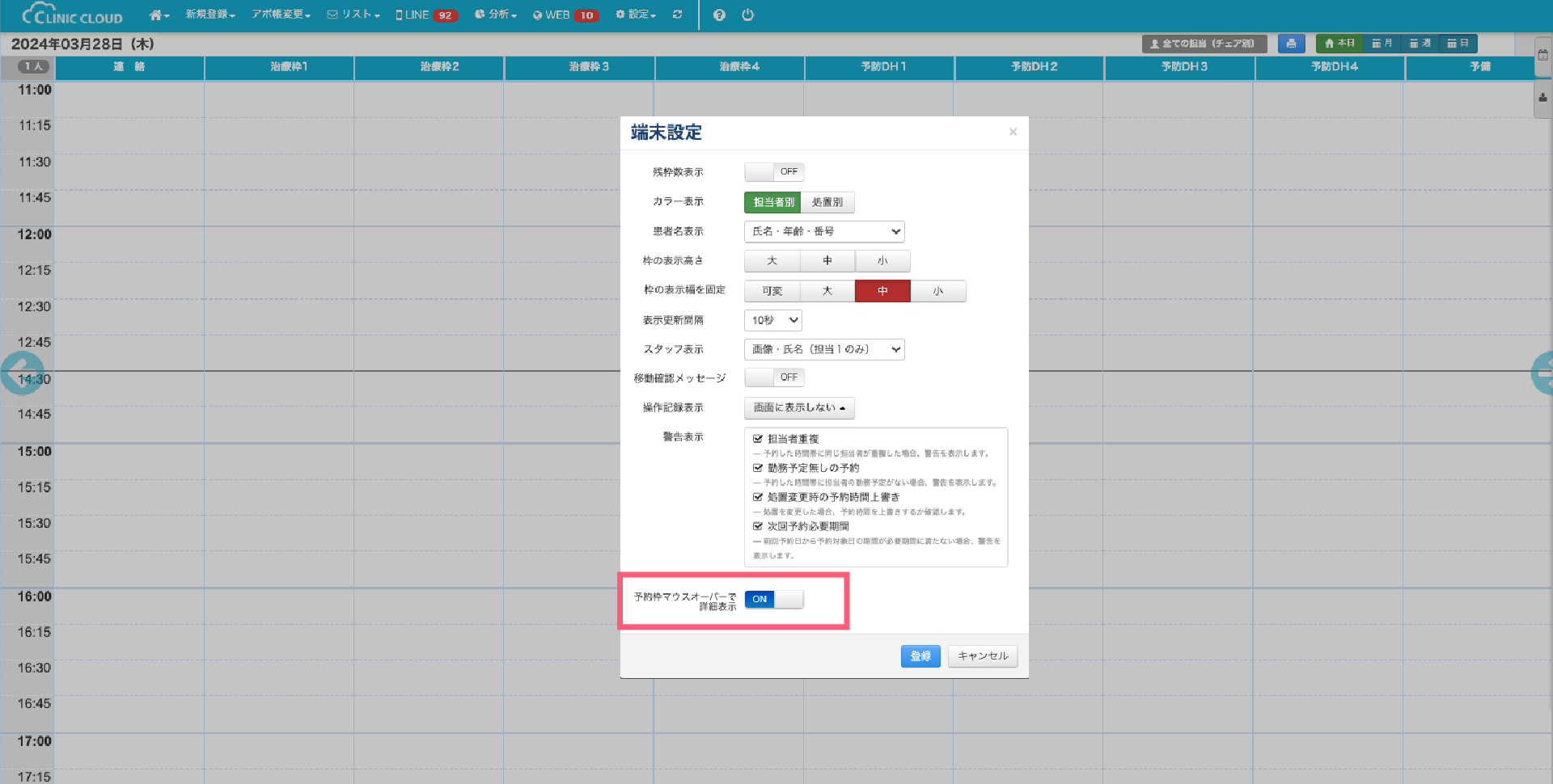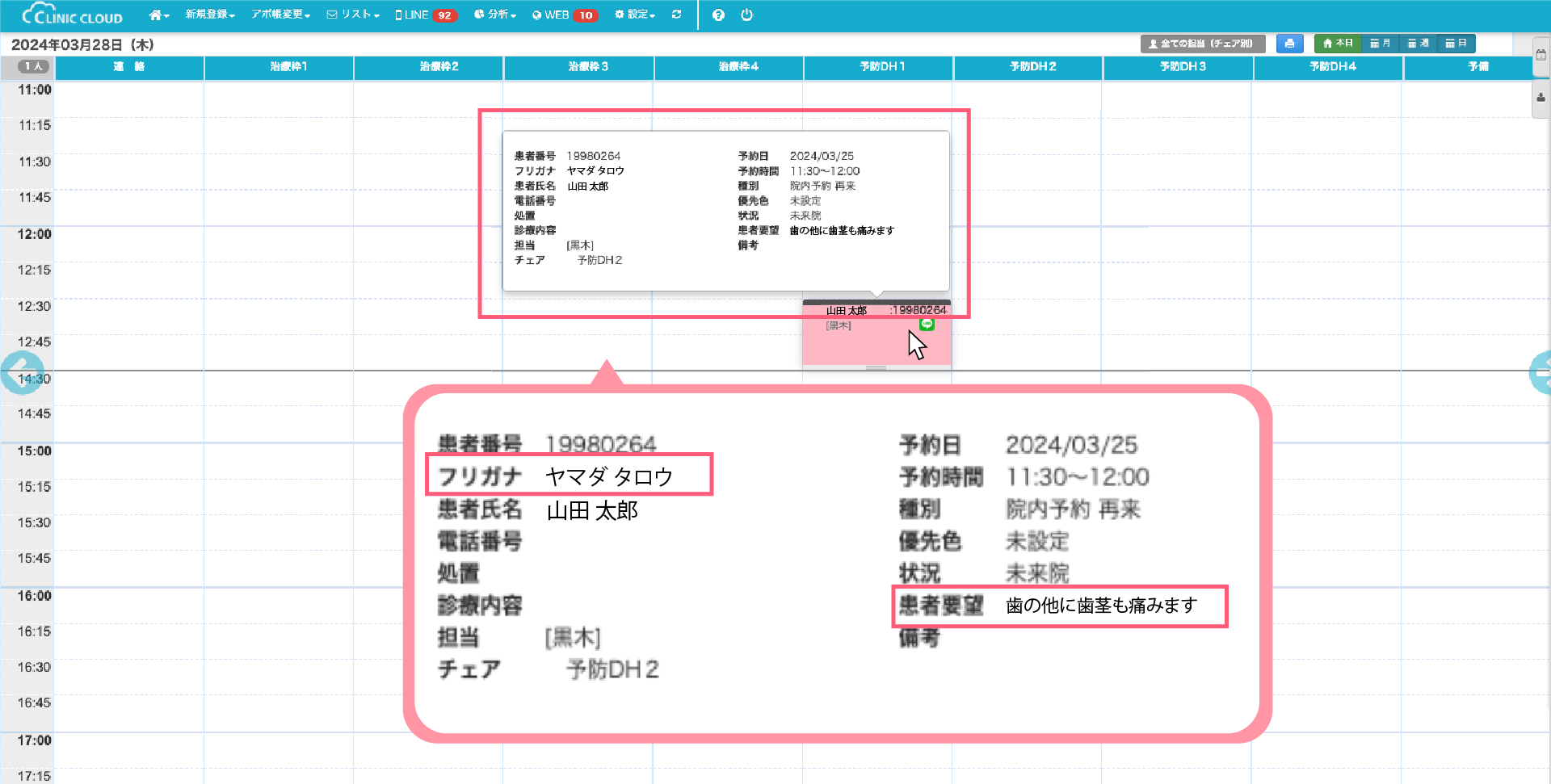 「予約枠」マウスオーバー時の項目追加のお知らせ 投稿日 2024年4月19日 ABOUT 「端末設定」の「予約枠マウスオンで詳細表示」をONに設定した際、アポイント帳上で表示される「予約枠詳細」の項目に「フリガナ」、「患者要望」を追加しました 設定>端末設定の「予約枠マウスオンで詳細表示」をONにした場合に表示されます ← 「未定者リスト」治療の続きの仕様変更のお知らせ → 「リコール設定」メッセージ自動配信機能、追加のお知らせ