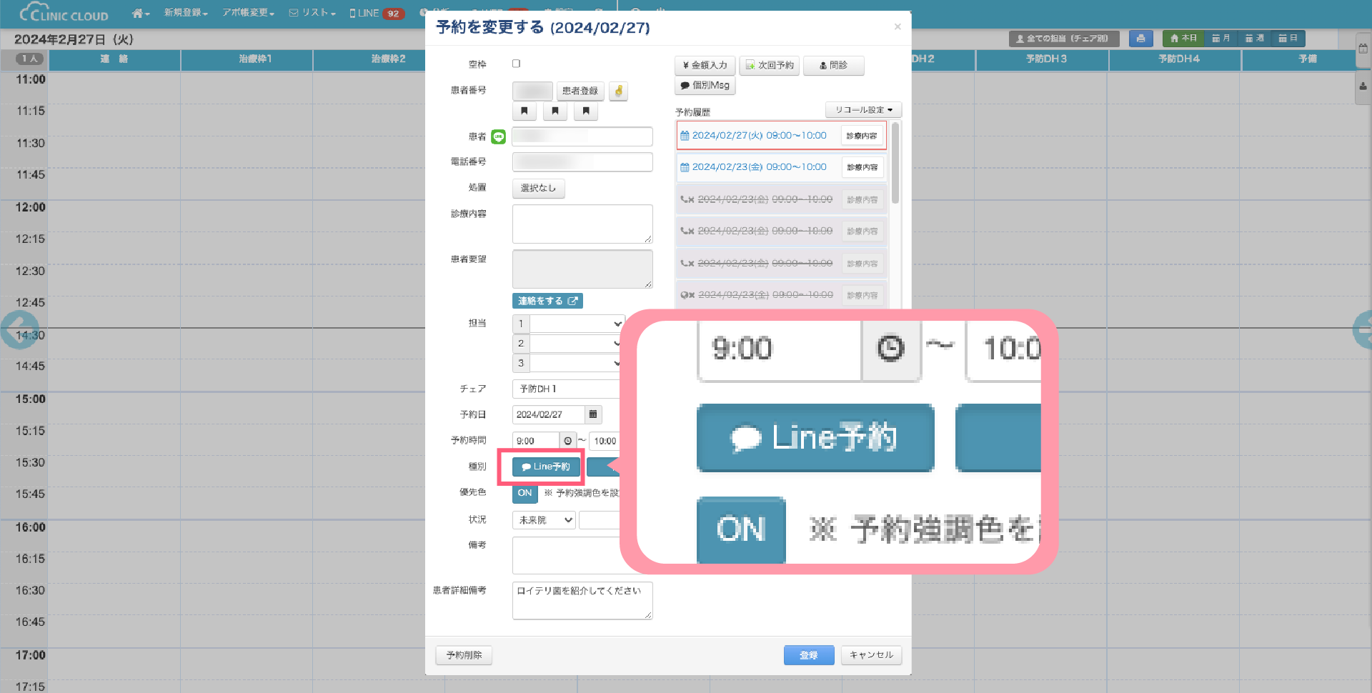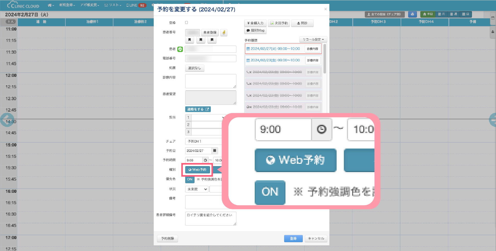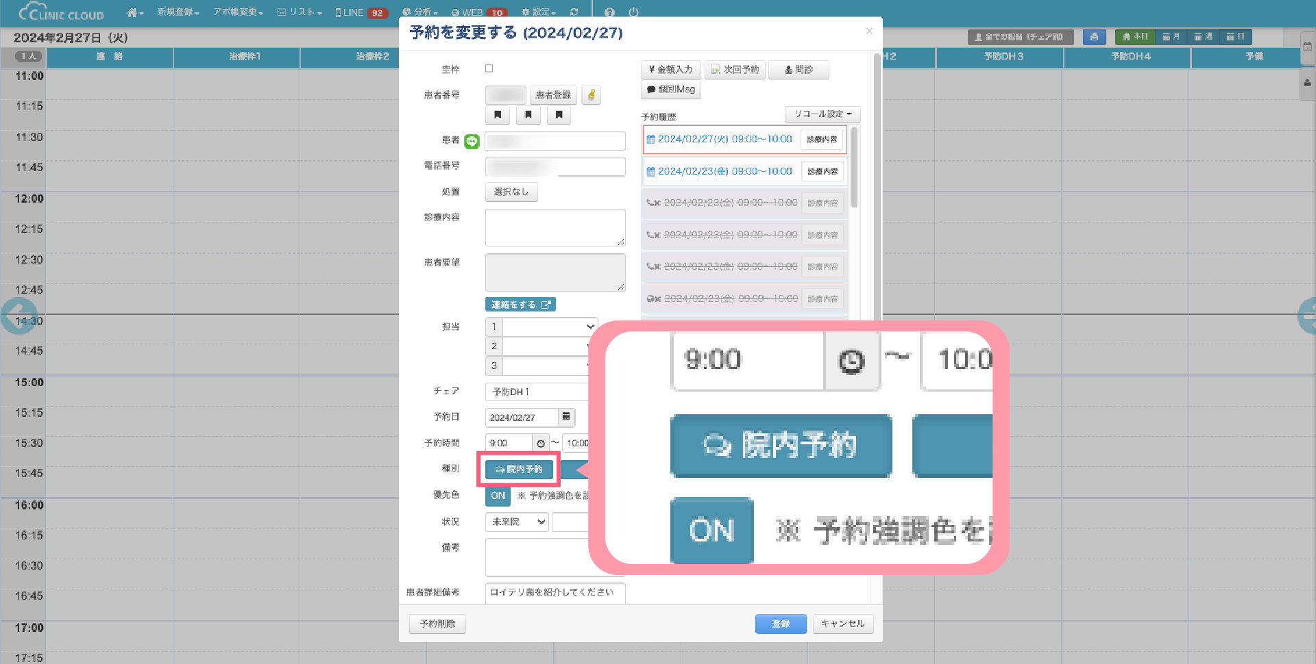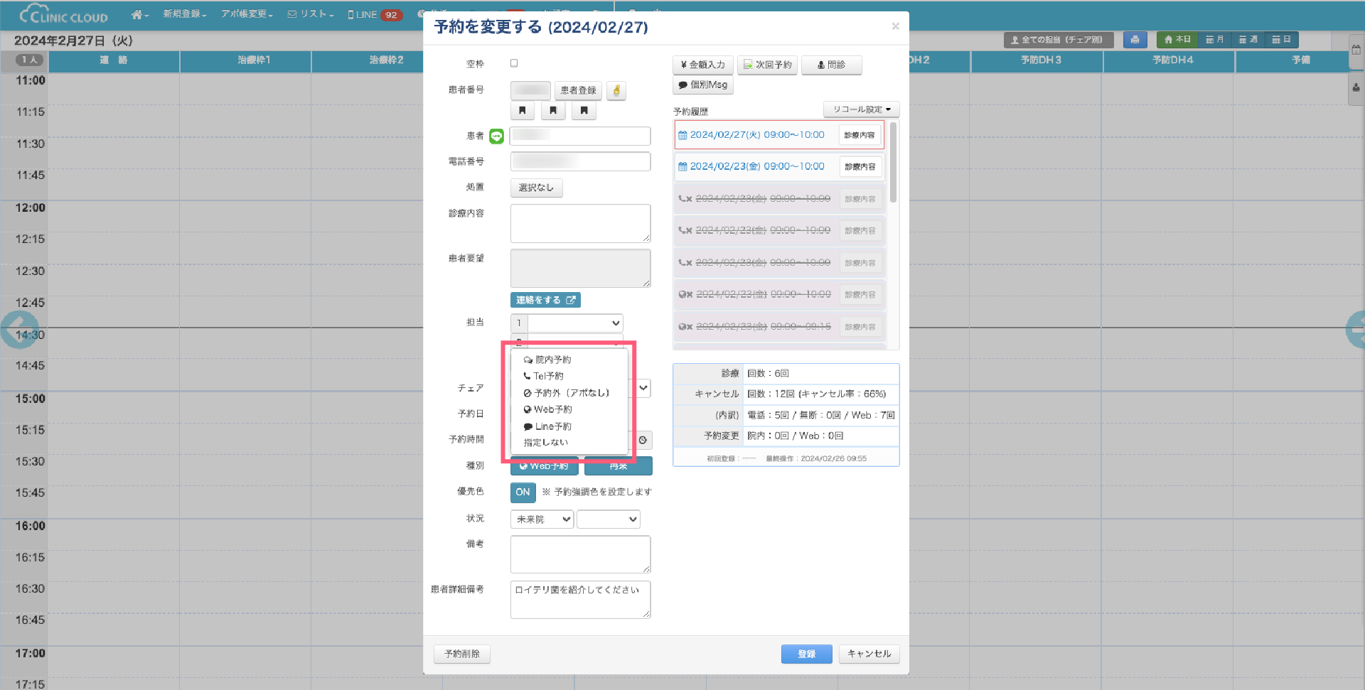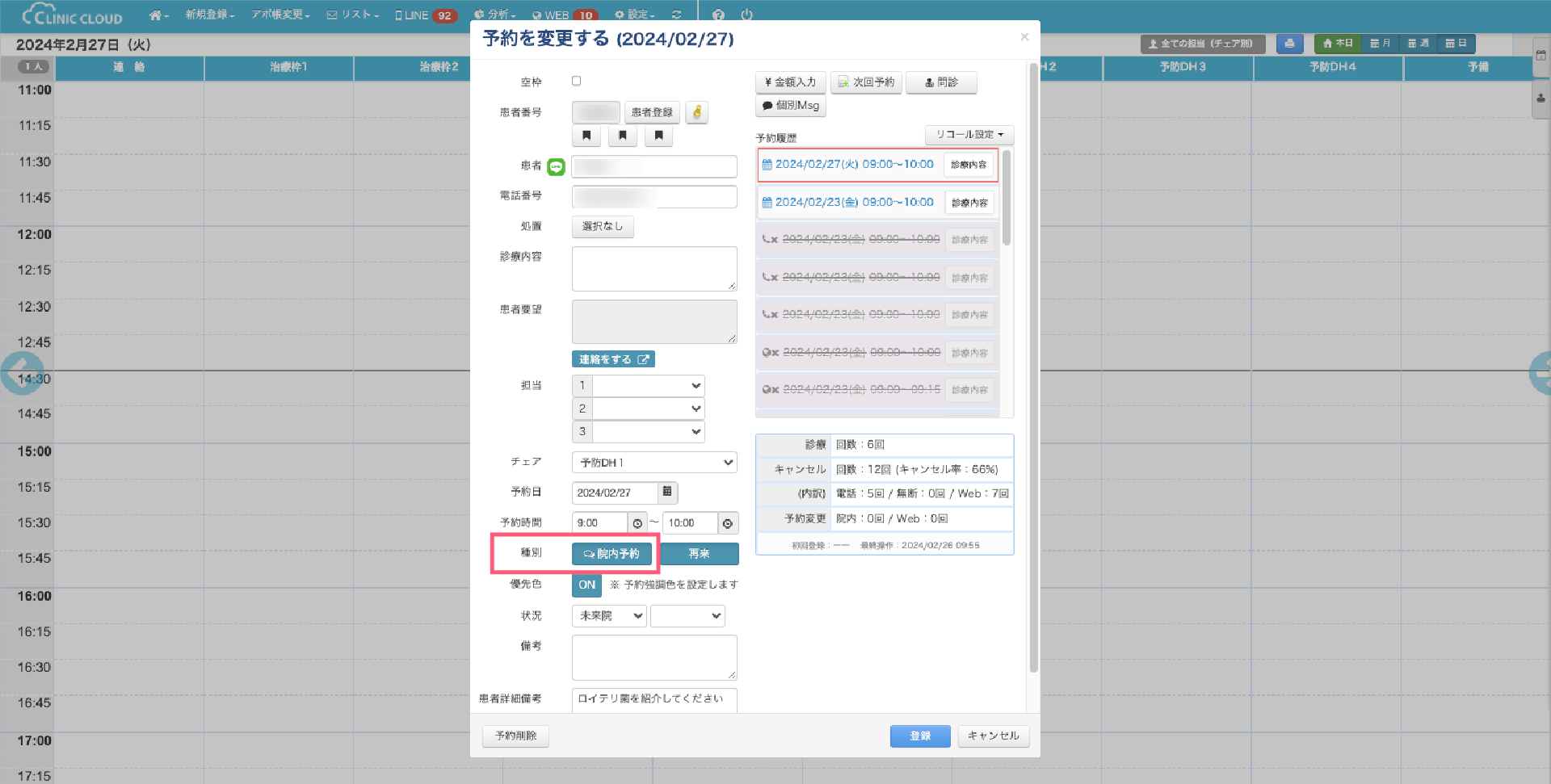 1-1.アポイント帳画面で予約を作成・複製した場合には「院内予約」に自動で種別が設定されます