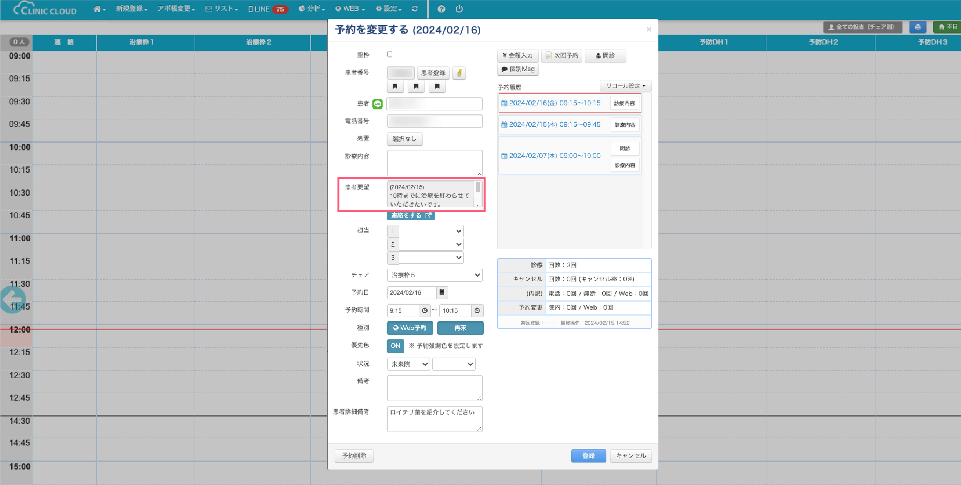 患者さんからの「その他(ご要望・ご質問)」の項目は、今までWEB予約の初回時にしか枠詳細の備考欄に記載されなかったため、WEBの予約変更・キャンセル時にも更新されるよう「患者要望」を追加しました