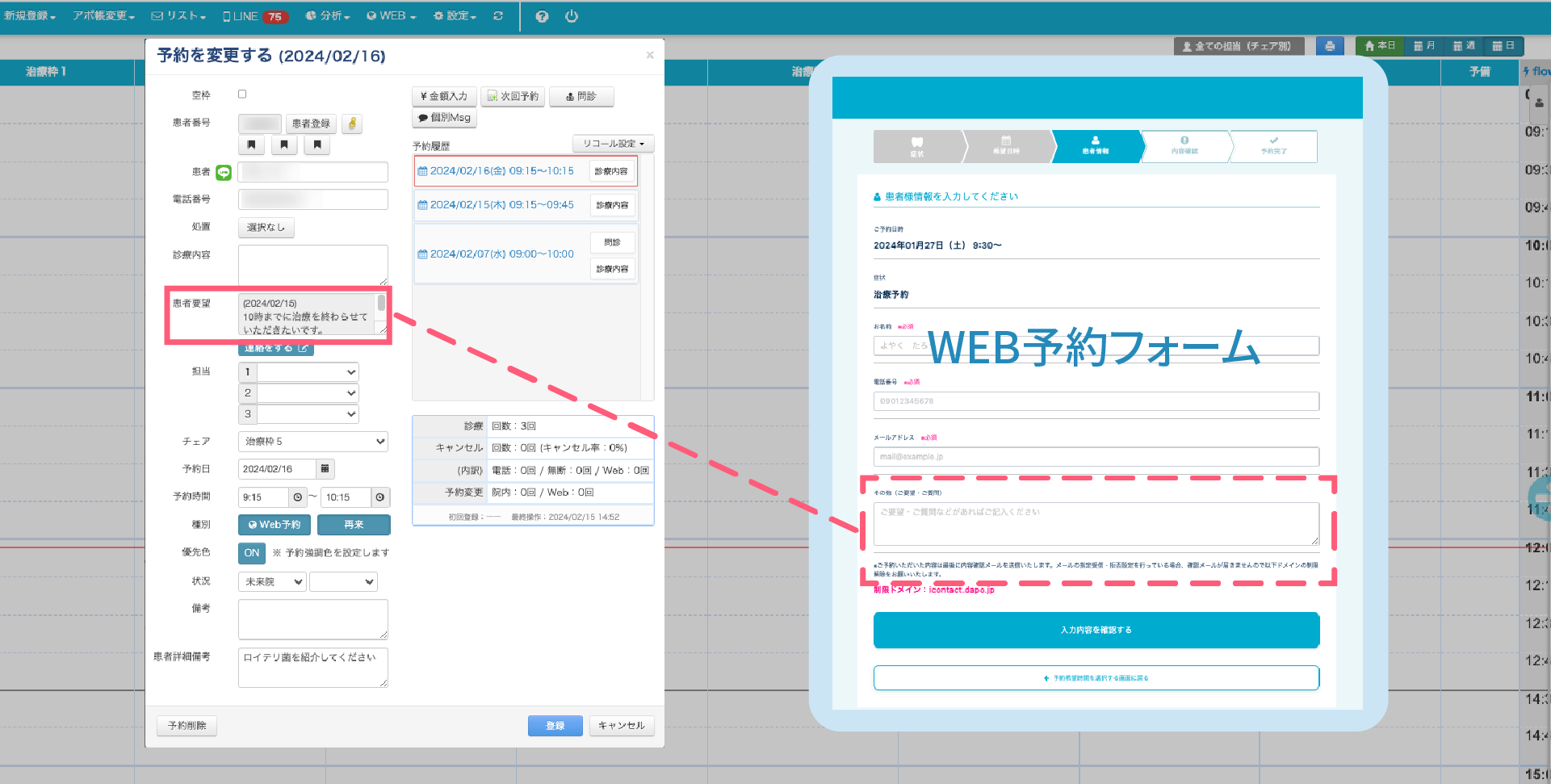 WEB予約フォーム、患者さんからの「その他(ご要望・ご質問)」の項目につきましては今後「患者要望」へ記載されます