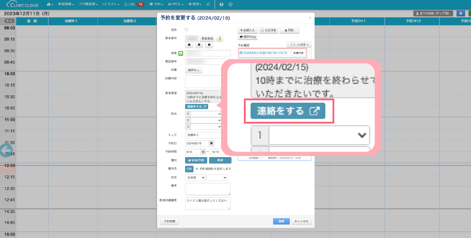 「患者要望」に対して、連絡したい場合には「連絡をする」からメッセージを送信することができます