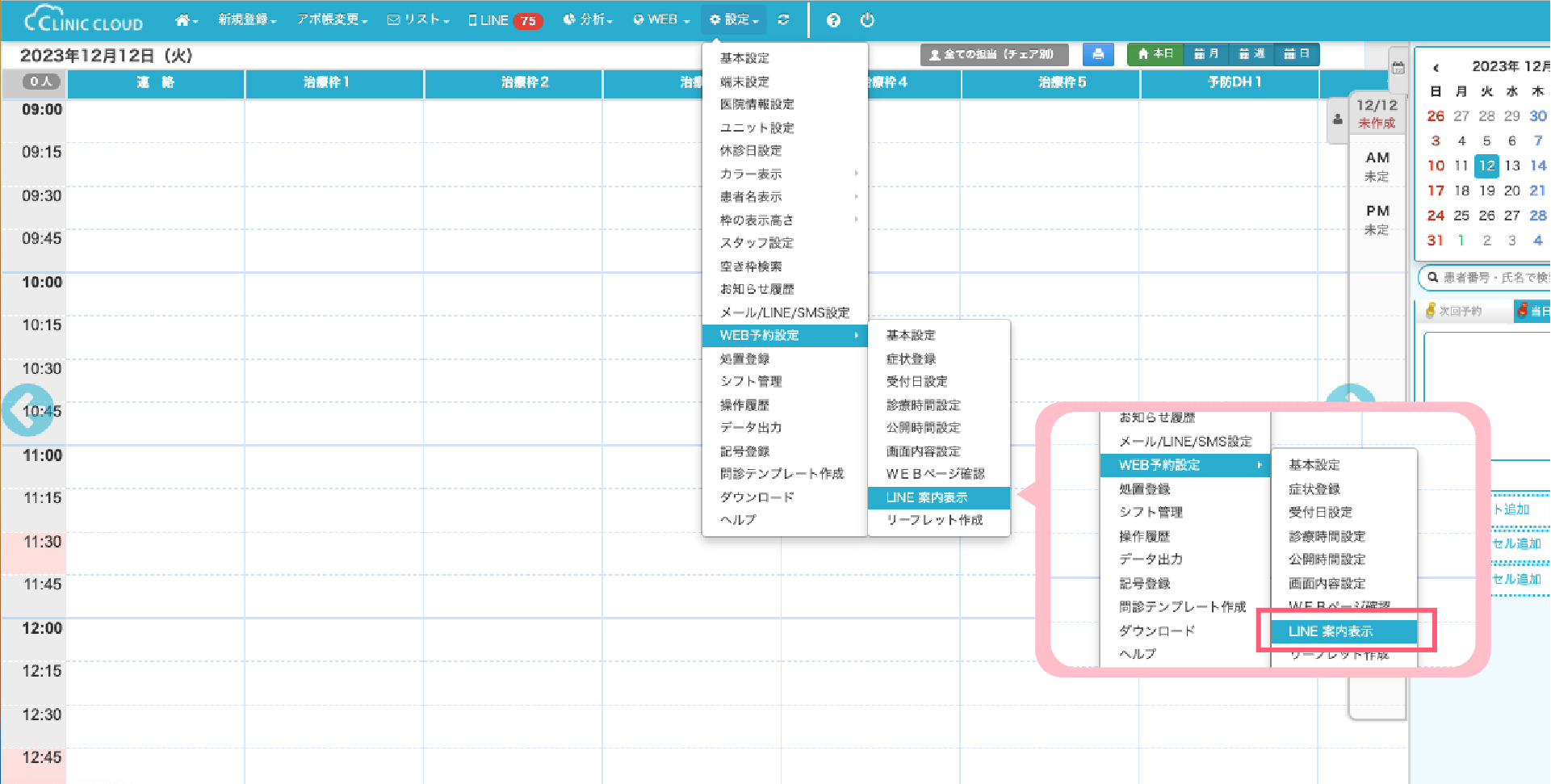1.「設定」>「WEB予約設定」>「LINE案内表示」をクリックします
